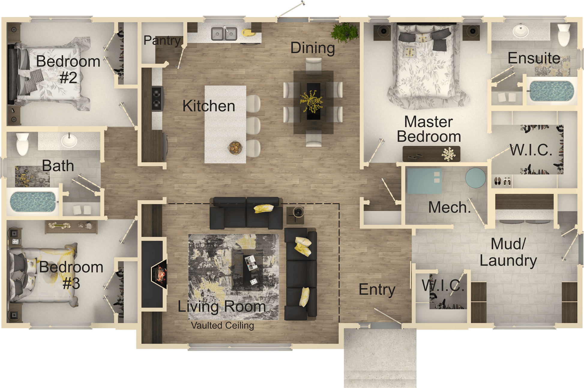 The Cozy Cove House Kit offers 1,720 sq ft of living space, featuring 3 bedrooms and 2 bathrooms. This modern design includes an open concept kitchen, dining, and living areas, perfect for family gatherings and entertaining. The home also features a vaulted ceiling in the living room, a large walk-in closet in the master bedroom, and a convenient side-entry mudroom with an additional walk-in closet and abundant storage.