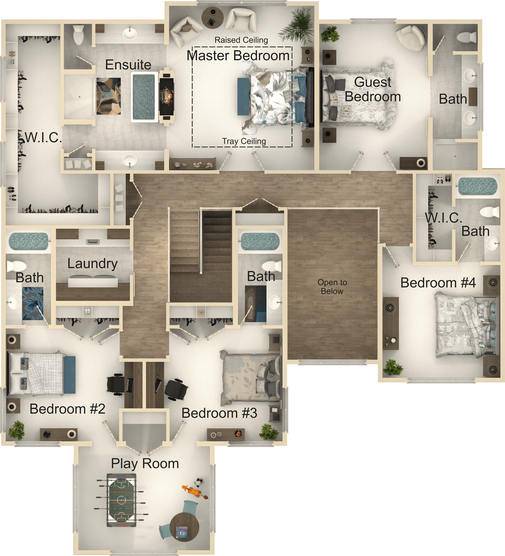 - **Second Floor**: All **5 bedrooms** are located on the second floor, providing privacy and tranquility for every family member. The **master suite** is a retreat in itself, featuring a luxurious bathroom with a soaking tub, walk-in shower, and dual vanities. The additional 4 bedrooms come with ensuite bathrooms, ensuring comfort and convenience. The **bonus spaces** on the upper level offer endless possibilities, from a home office to a playroom or media room.