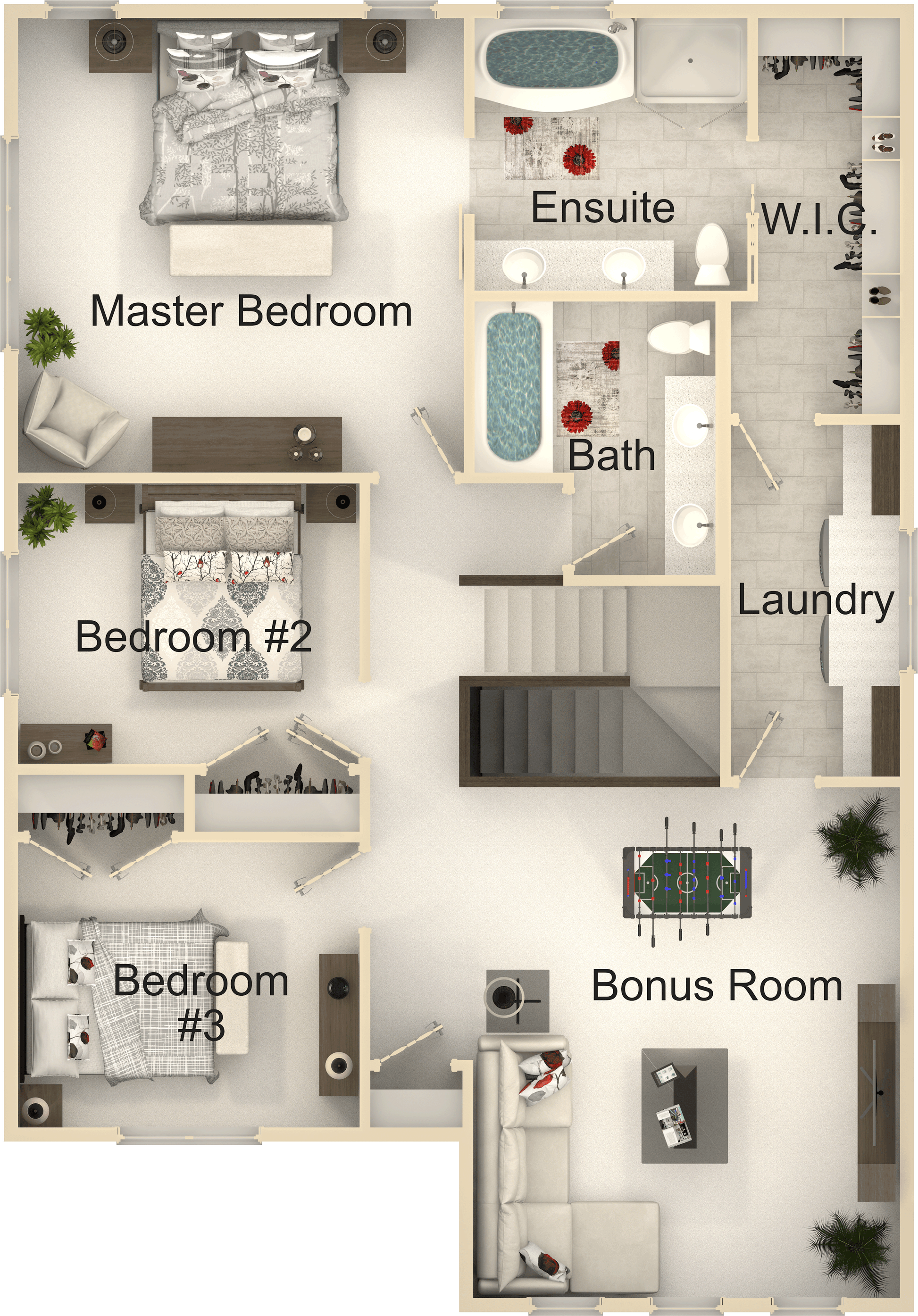 The **first floor**, with **1,300 sq. ft.**, offers an open-concept layout that integrates the kitchen, dining, and living spaces, making it ideal for both everyday living and entertaining. The abundance of windows on this level ensures plenty of natural light, enhancing the warm and inviting atmosphere. Upstairs, the **second floor** provides **1,318 sq. ft.** of space, where all the bedrooms are located along with a spacious bonus room. This arrangement provides privacy and quiet for sleeping, while the bonus room adds versatility for other activities.